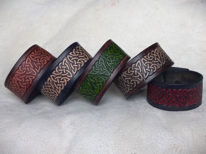 Náramek z hovězí kůže, zdobený keltským motivem. Šířka náramku je 3,5 cm, zapínání je na sedlářský knoflík („panenka“). Je možno vyrobit v různých barevných kombinacích – to prosím uveďte do poznámky. Stejně jako obvod zápěstí a jestli chcete náramek na těsno (přidává se zhruba 0,5cm) a nebo na volno (pak napište jak moc). Náramek už má povrchovou úpravu a nevyžaduje žádnou další zvláštní péči.